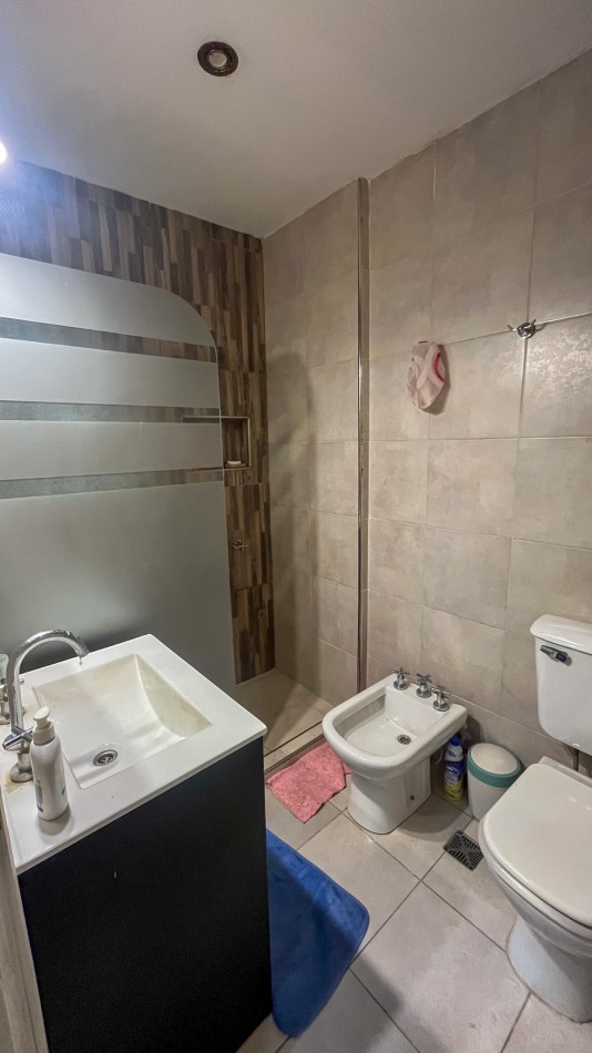 Baño completo, revestido en cerámicos, con pediluvio y mampara de vidrio.