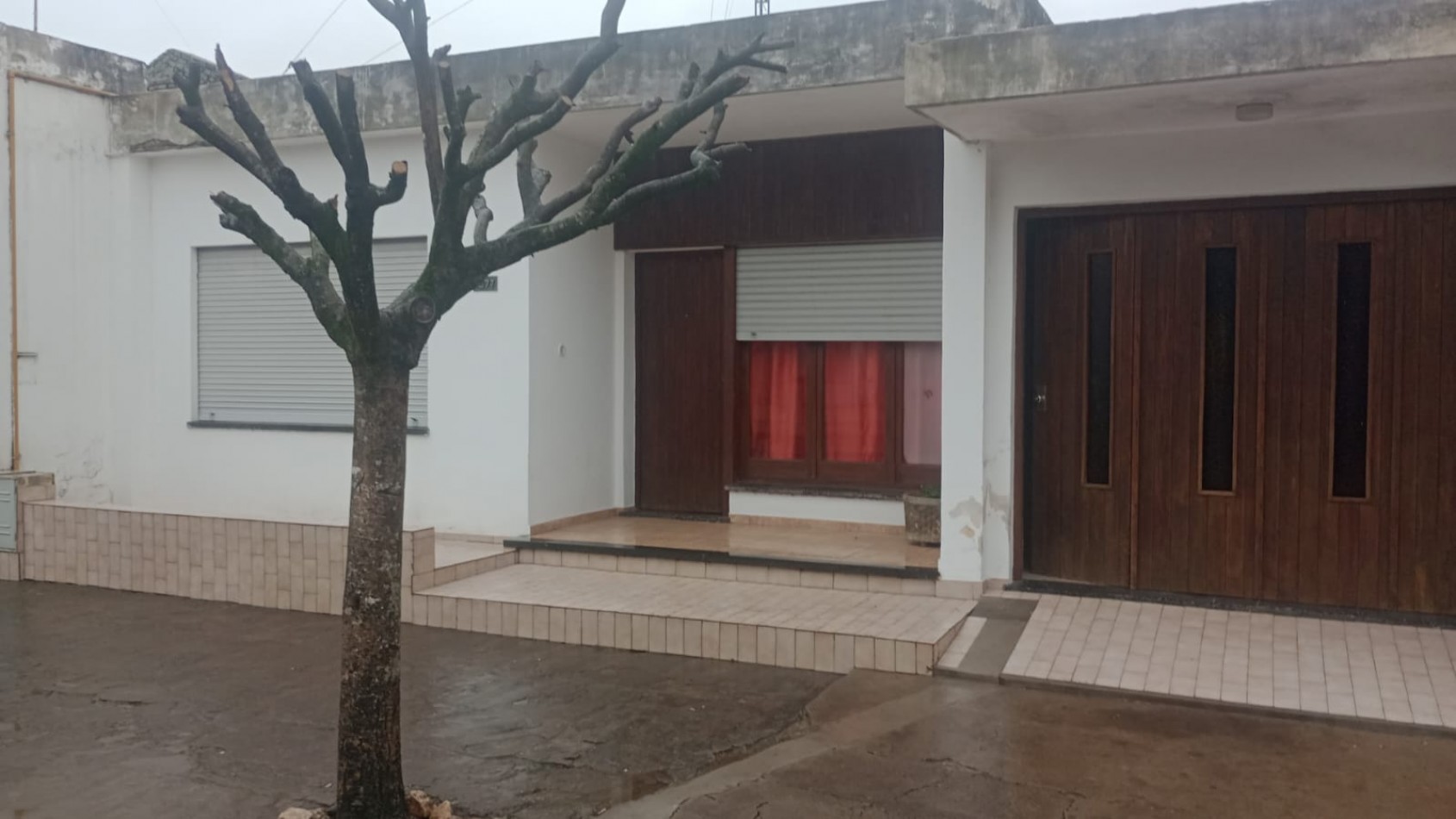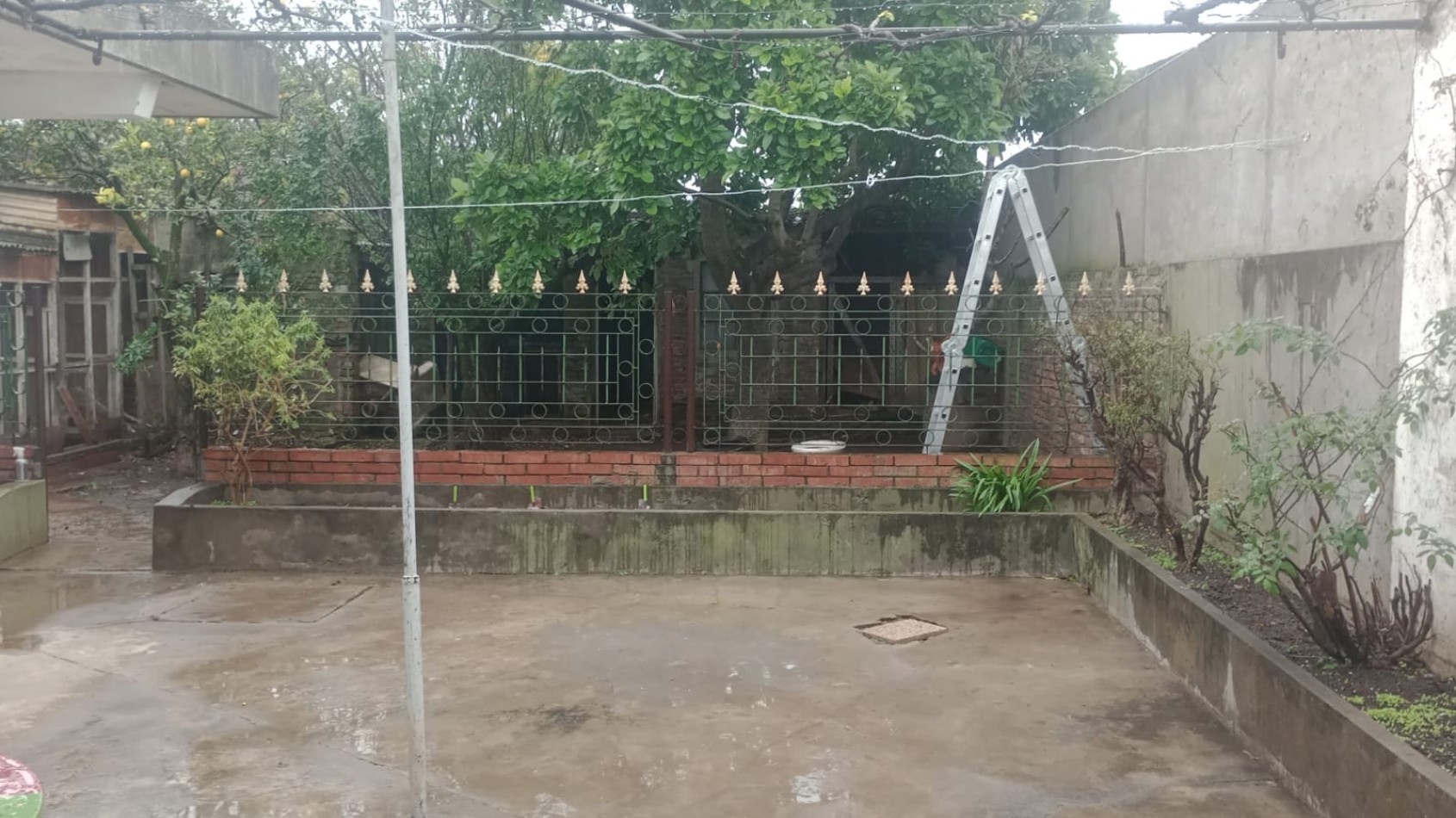 Patio interno pequeño con piso de cemento y parque atrás con frutales.