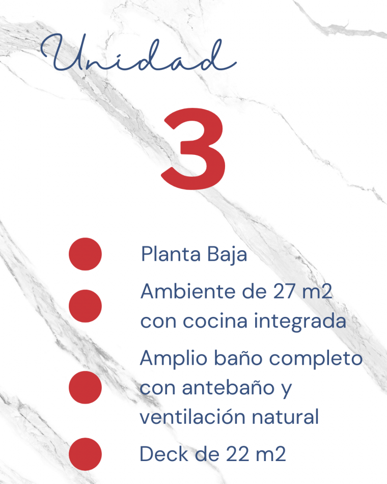 Cada unidad comprende un ambiente integrado (de distintas dimensiones dependiendo de la unidad), cocina equipada, baño completo y deck o terraza.