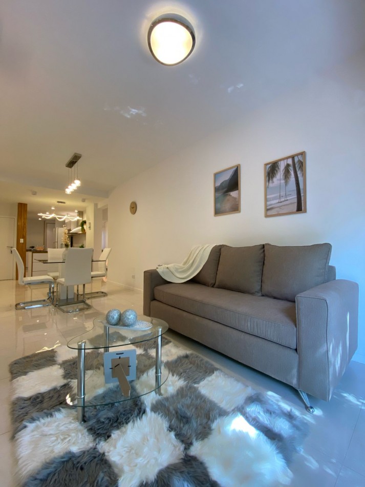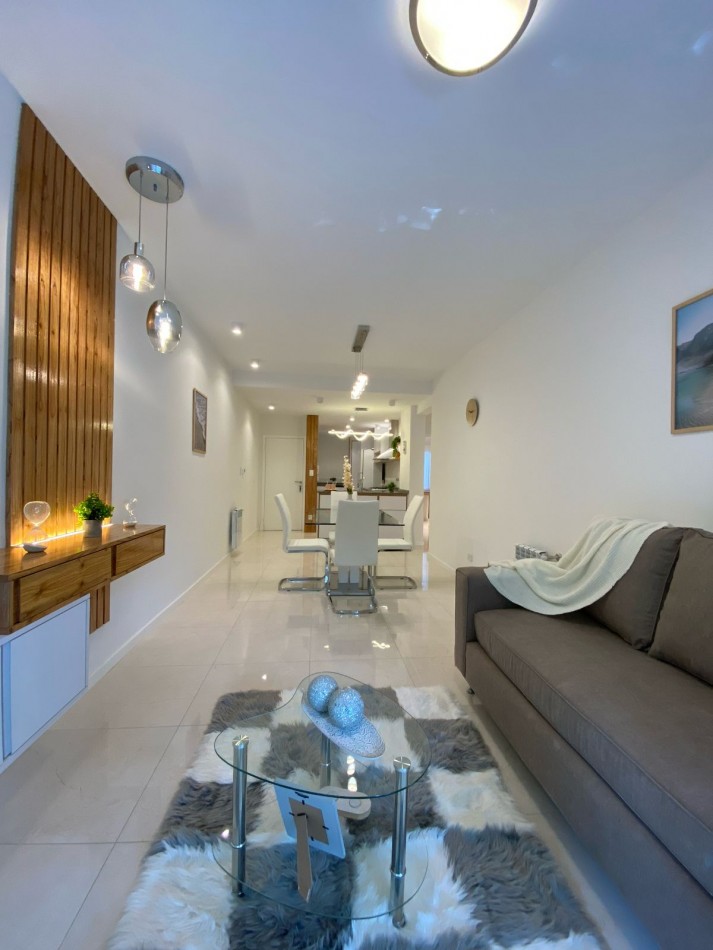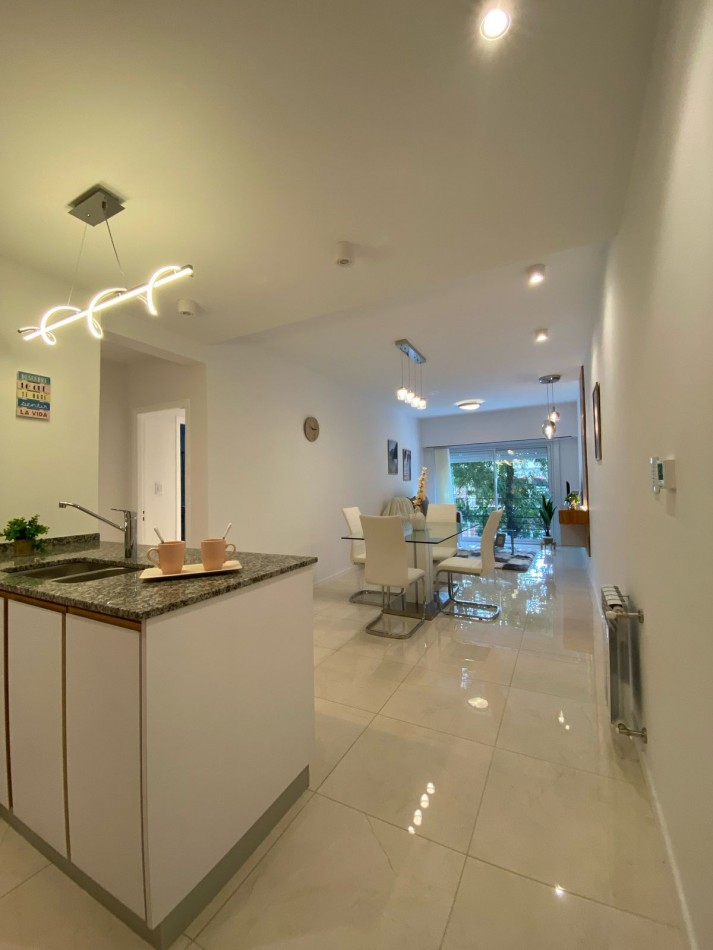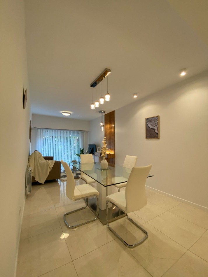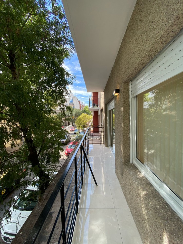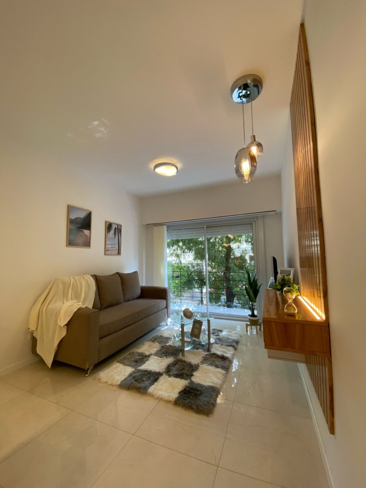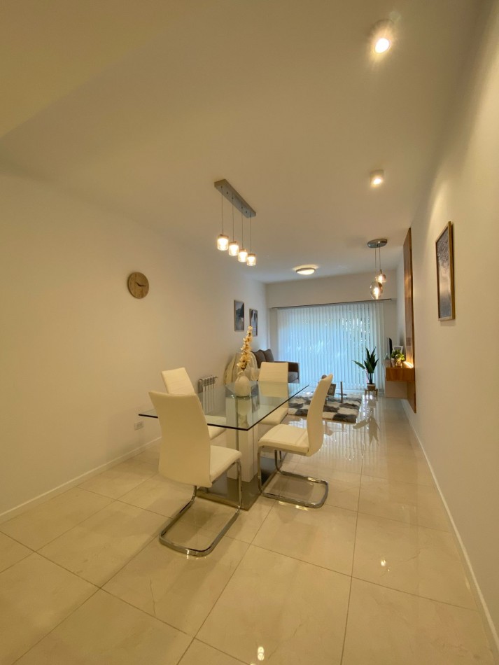 Living comedor al frente y muy luminoso, con piso de porcelanatos y amplio ventanal con salida al balcón corrido.