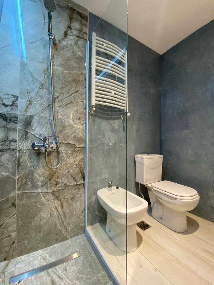 Baño completo con pediluvio y mampara de vidrio.