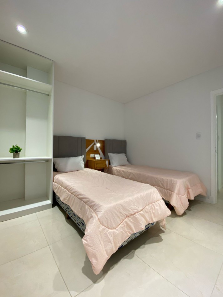 Dormitorio principal al frente, con piso de porcelanatos, placard empotrado con interiores a medida y puertas corredizas. Baño en suite, con pediluvio y mampara de vidrio.