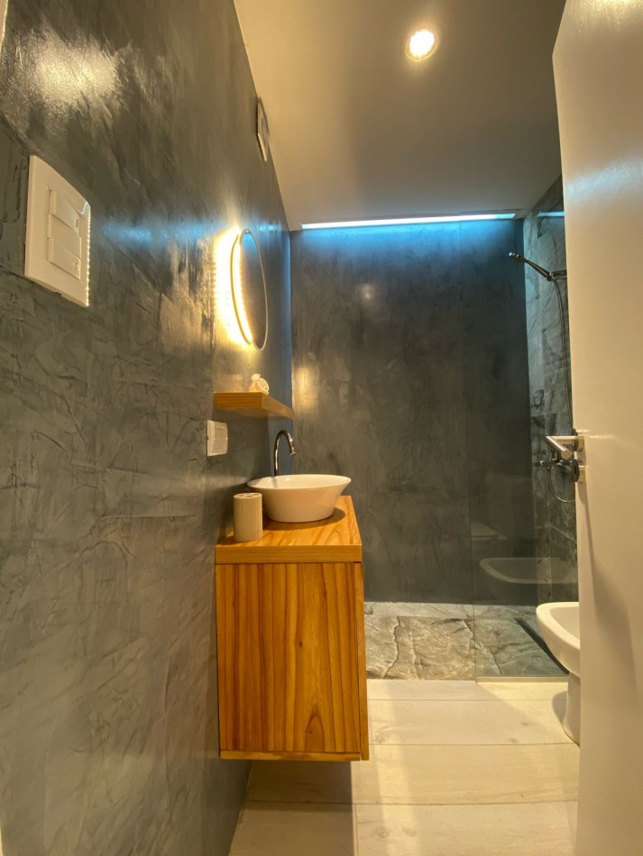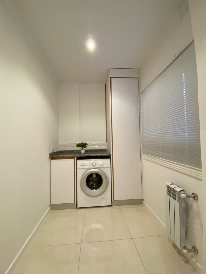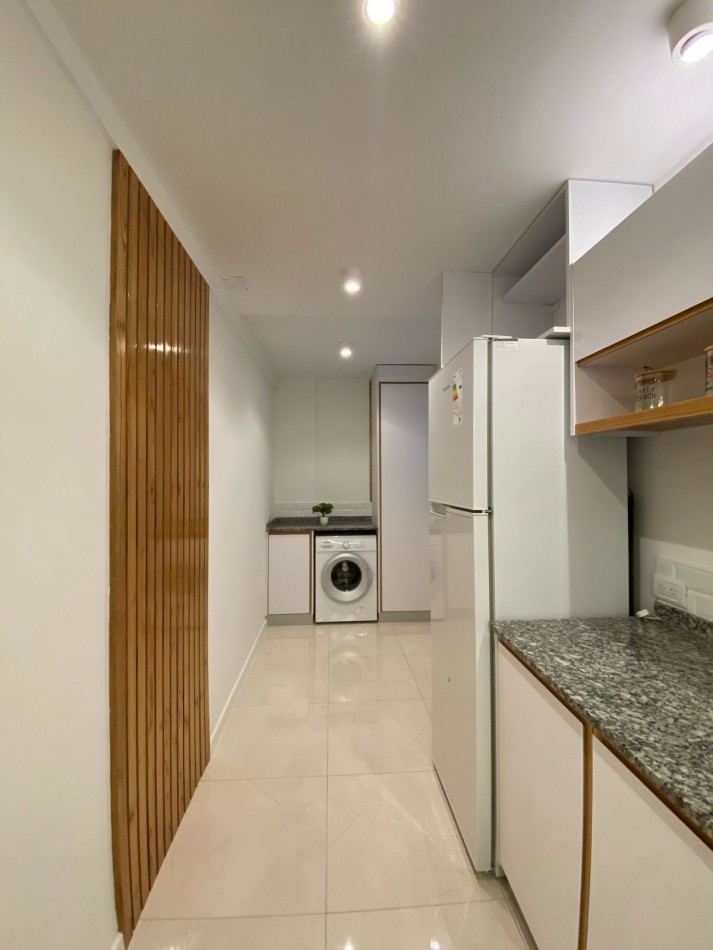 Cocina integrada, con ventilación natural y muebles a medida. Equipada con anafe, horno empotrado y heladera con freezer. Zona de lavadero incorporada, con lavarropas instalado y mueble de guardado.