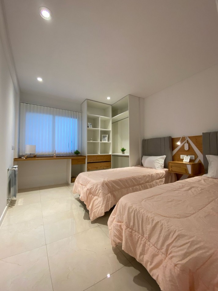 Segundo dormitorio al contrafrente, con piso de porcelanatos, placard a medida y espacio de escritorio con mueble.