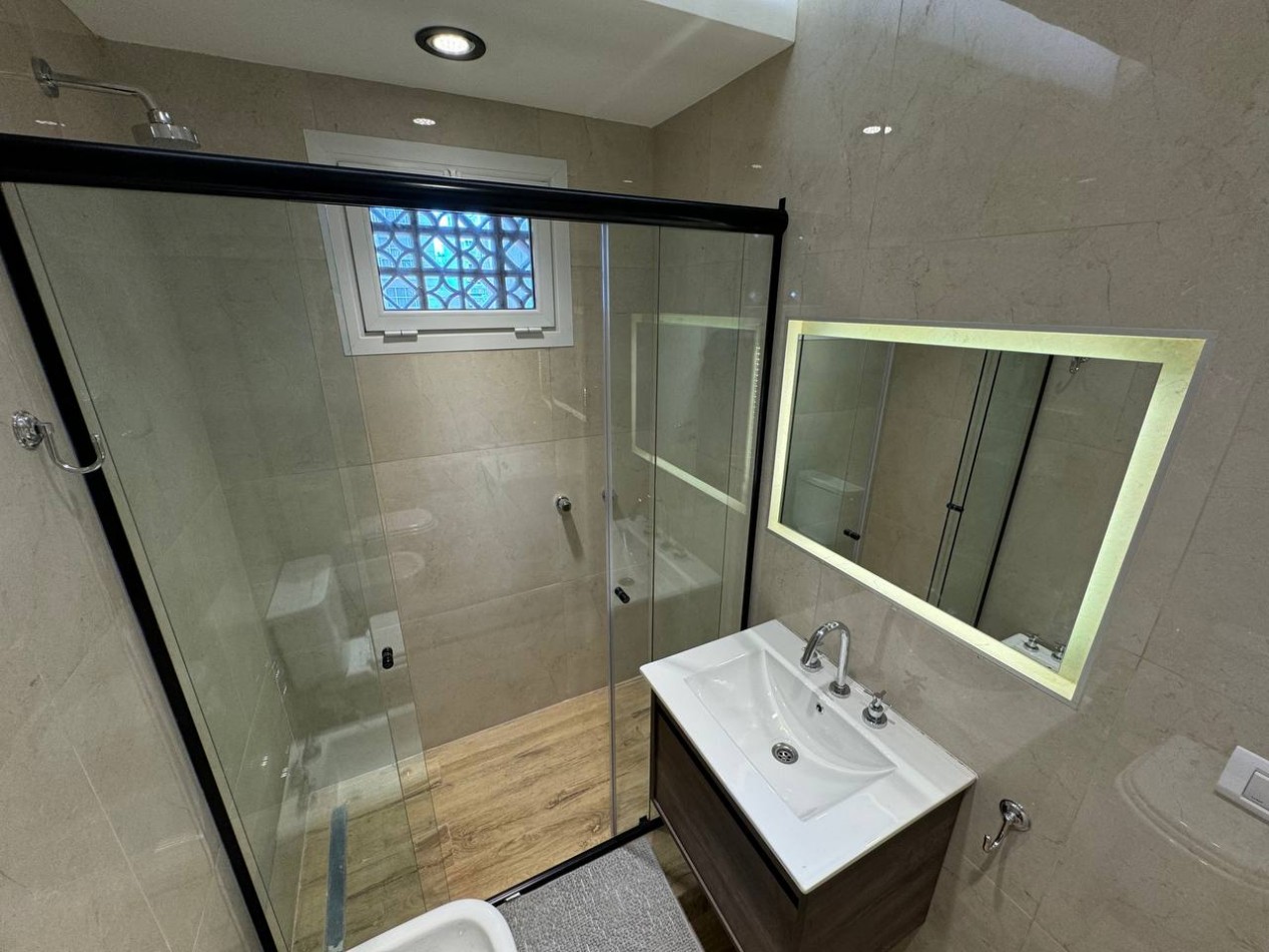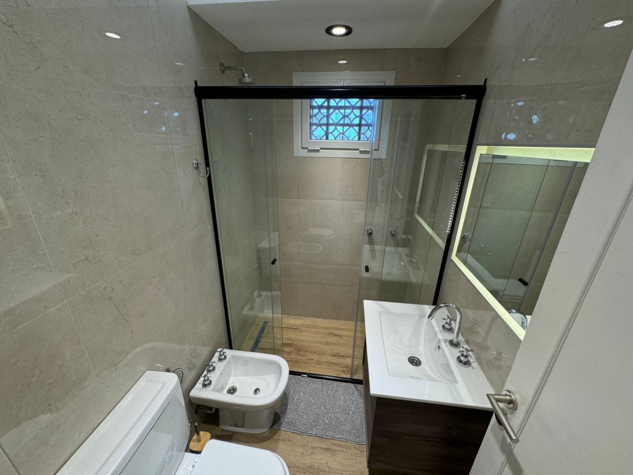 Baño principal completo, con pediluvio, mampara de vidrio y ventilación natural.