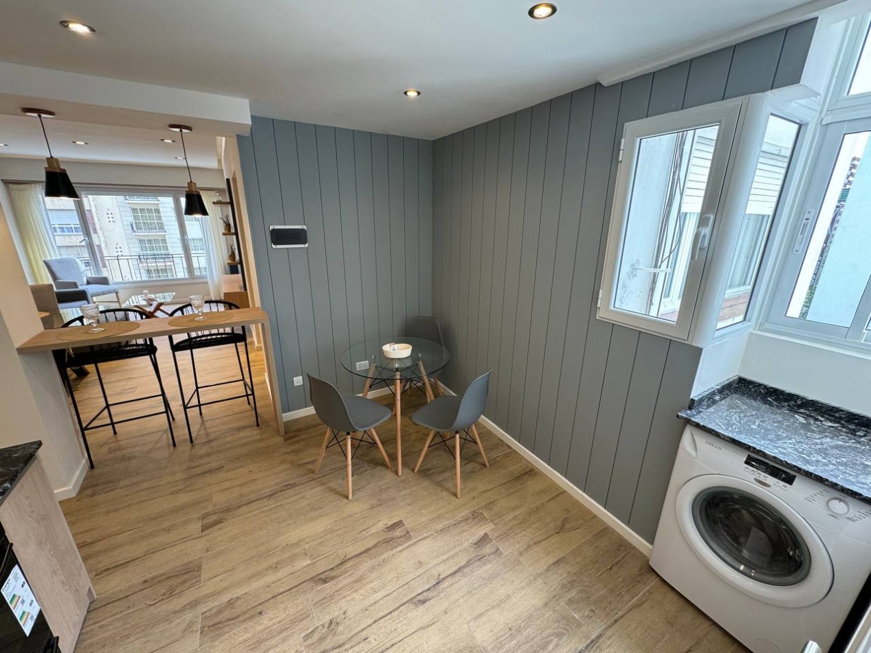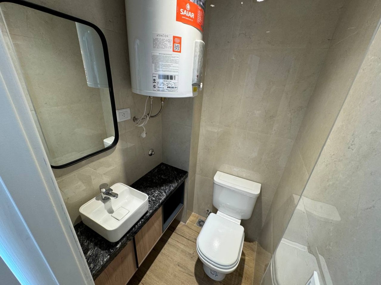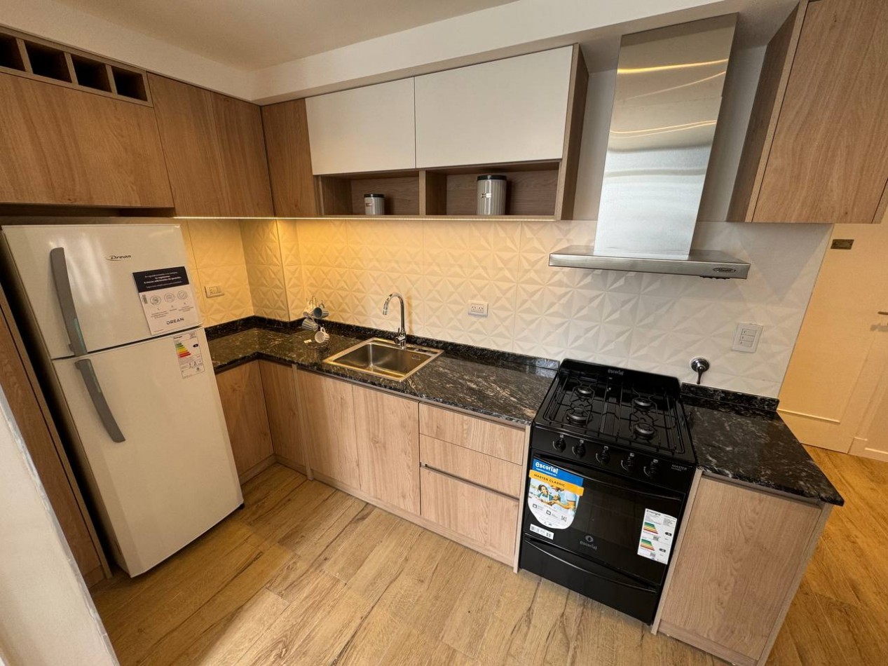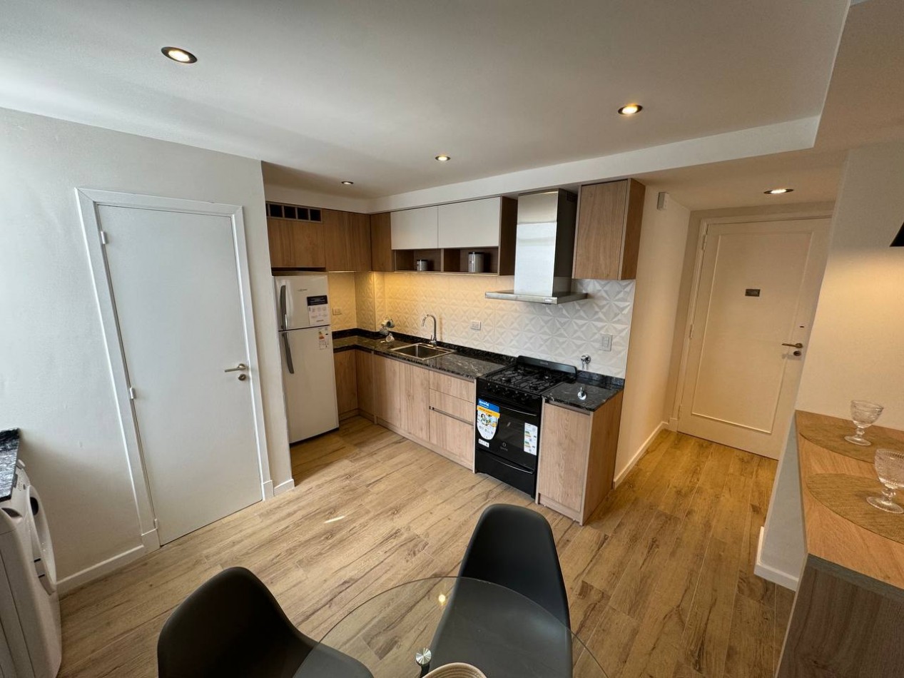Cocina comedor semi integrada, con muebles a medida, ventilación natural y barra desayunadora. Equipada con artefacto de cocina, heladera con freezer y lavarropas instalado.