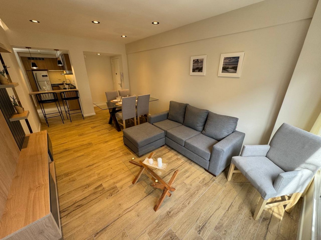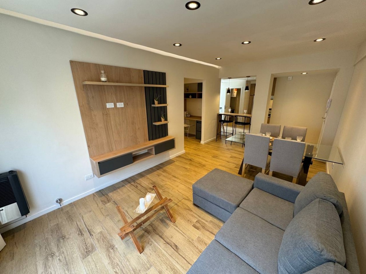 Living comedor con piso de porcelanato, calefactor tiro balanceado y amplio ventanal con balcón francés.