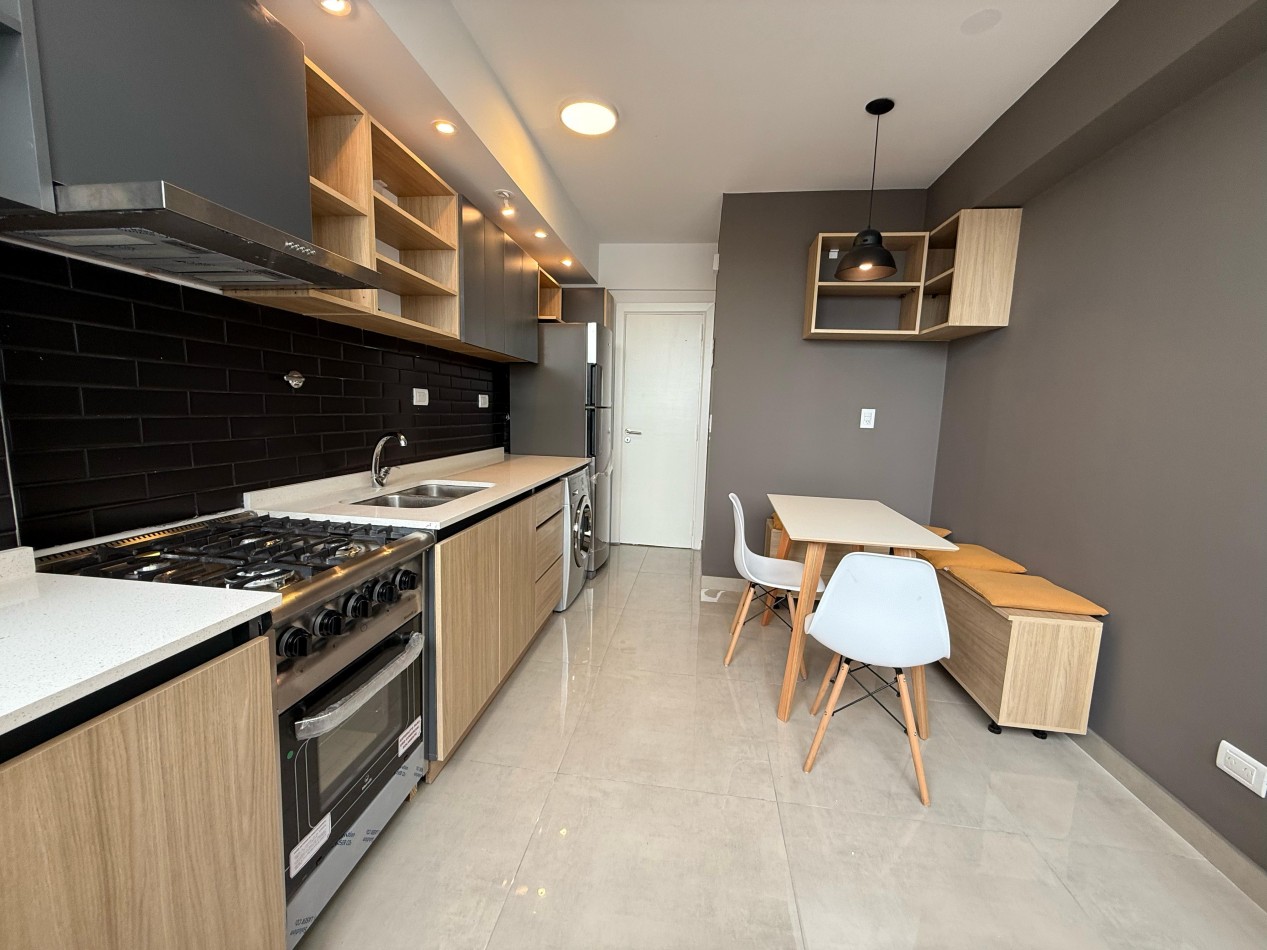 Cocina comedor separada, con ventilación natural, muebles a medida y desayunador. Equipada con artefacto de cocina en acero inoxidable, campana de extracción de olores, heladera con freezer y lavarropas instalado.