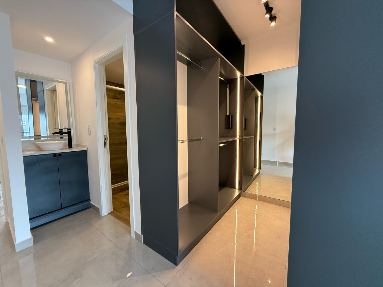 Dormitorio principal con piso de porcelanatos, baño compartimentado completo en suite, con pediluvio y mampara de vidrio; y amplio vestidor a medida.