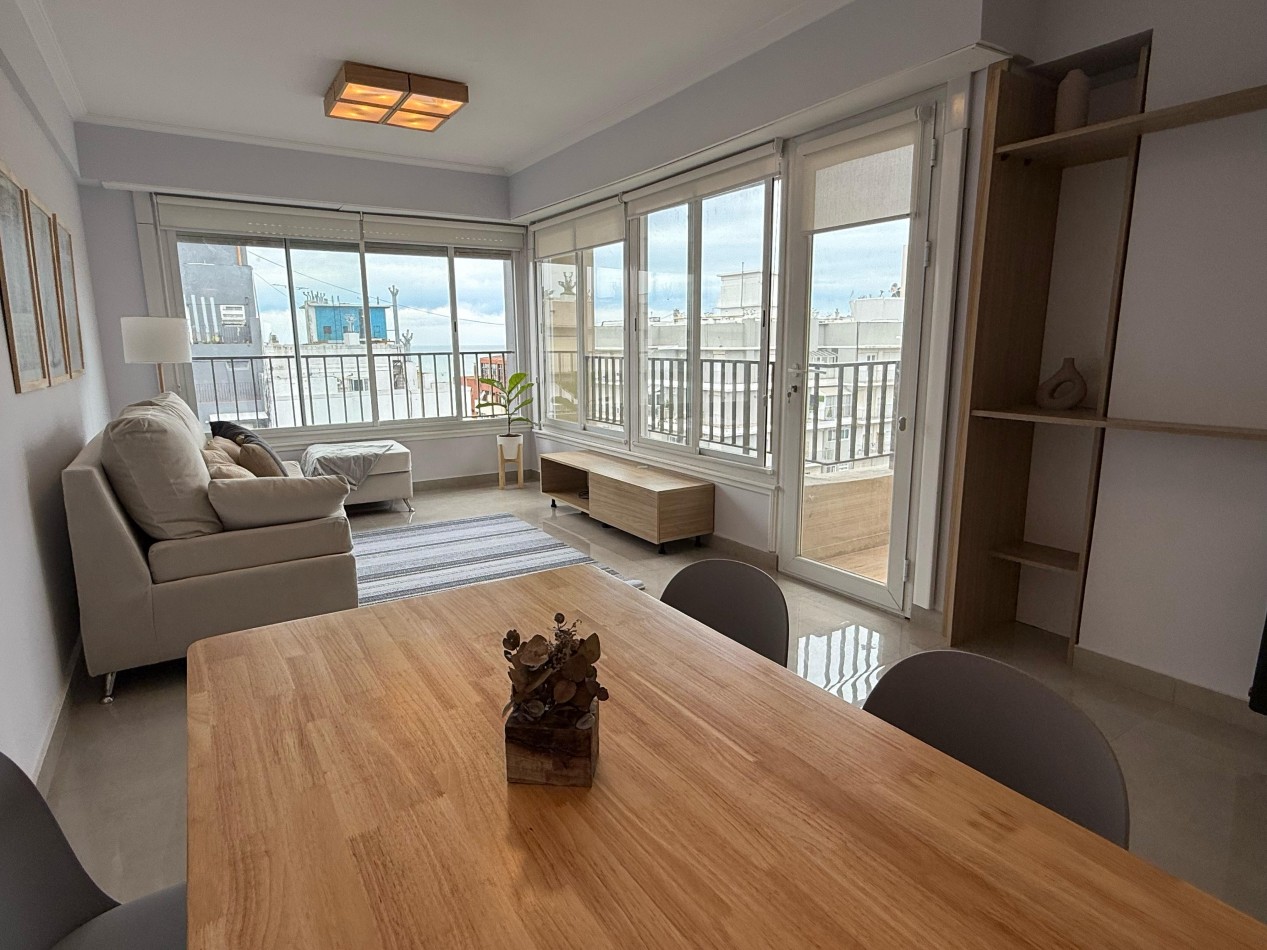 Living comedor con amplio ventanal, balcón terraza y vista parcial al mar.