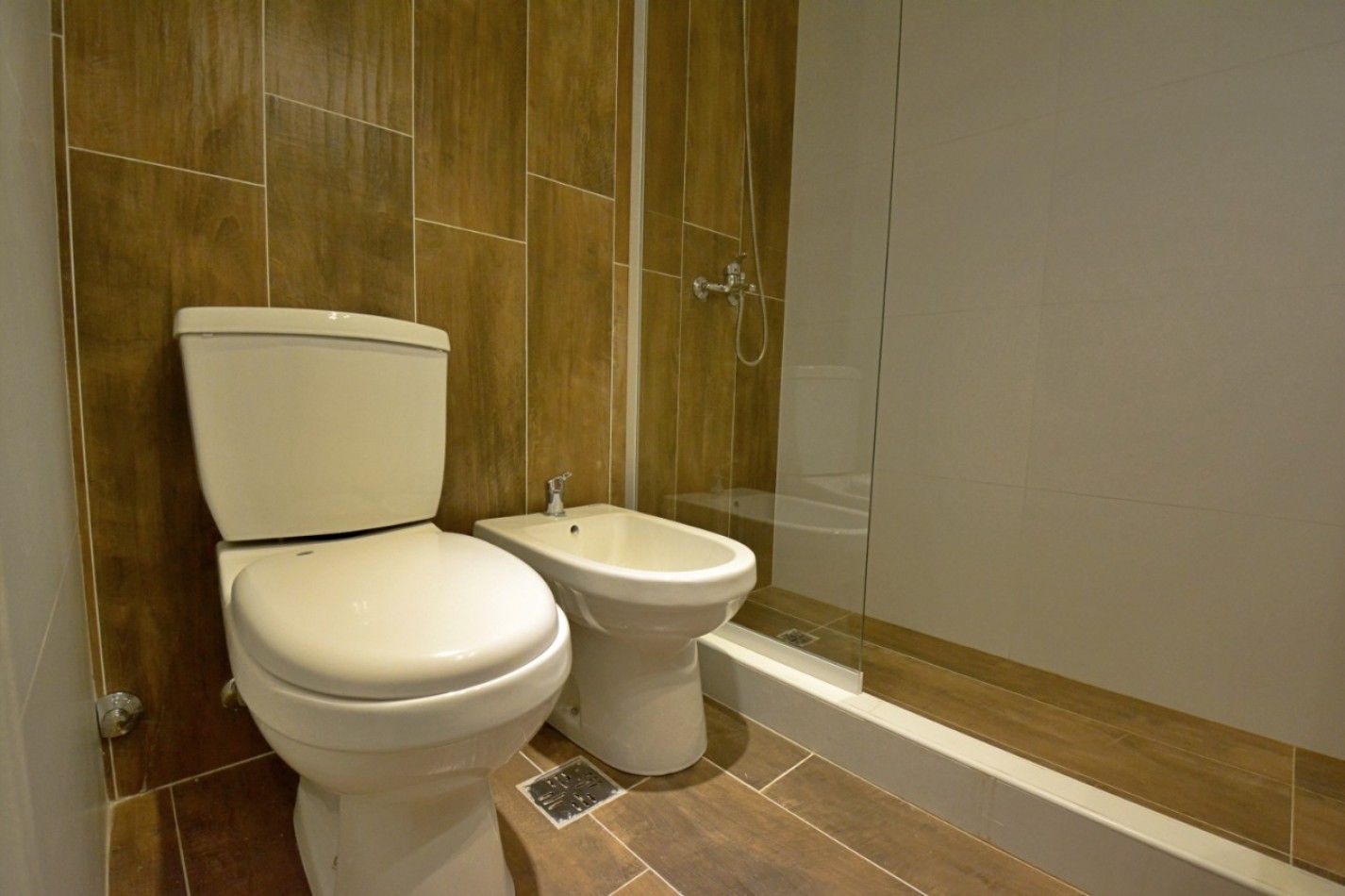 Baño completo con pediluvio y mampara de vidrio.