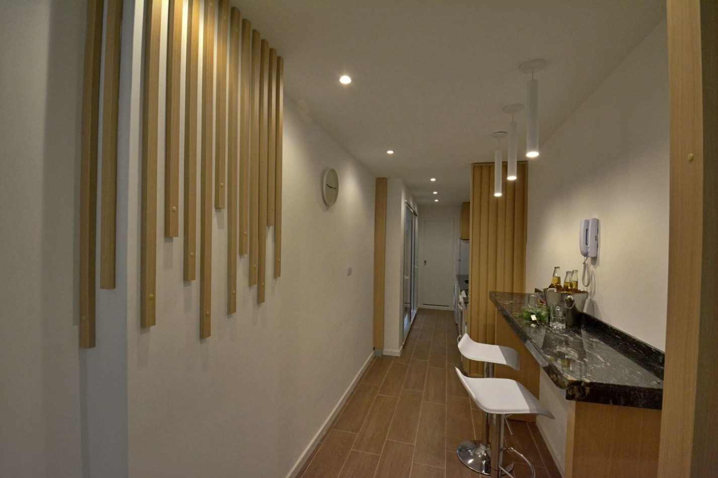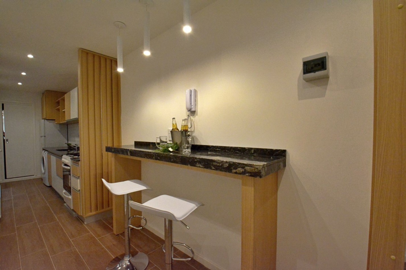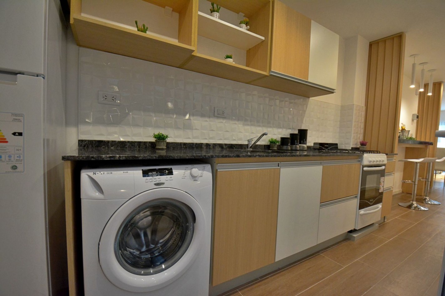 Cocina integrada, con ventilación natural y amplia barra desayunadora, muebles a medida, espacio para lavarropas y salida al patio.