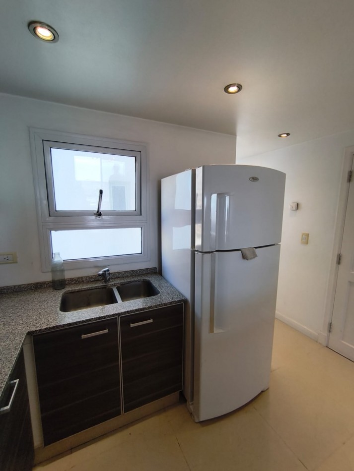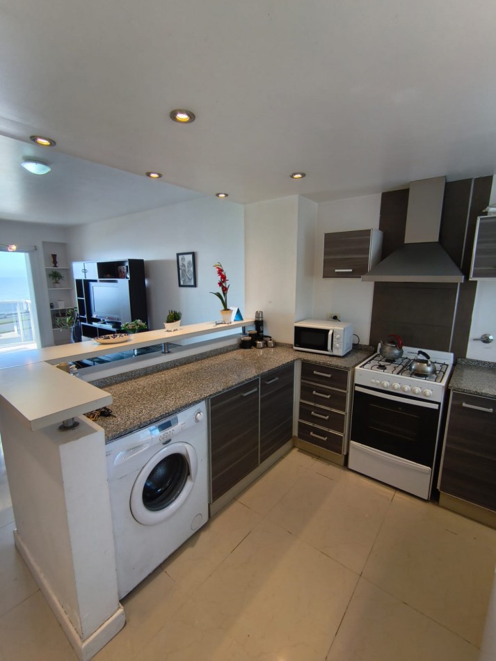 Cocina semi integrada con barra desayunadora, muebles a medida y ventilación natural. Equipada con artefacto de cocina, campana de extracción de olores y conexión para lavarropas.
