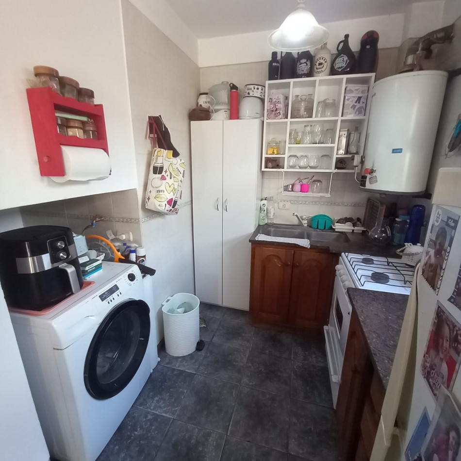 Cocina integrada, muy luminosa, con ventilación natural, muebles bajo mesada en madera maciza, y conexión para lavarropas.