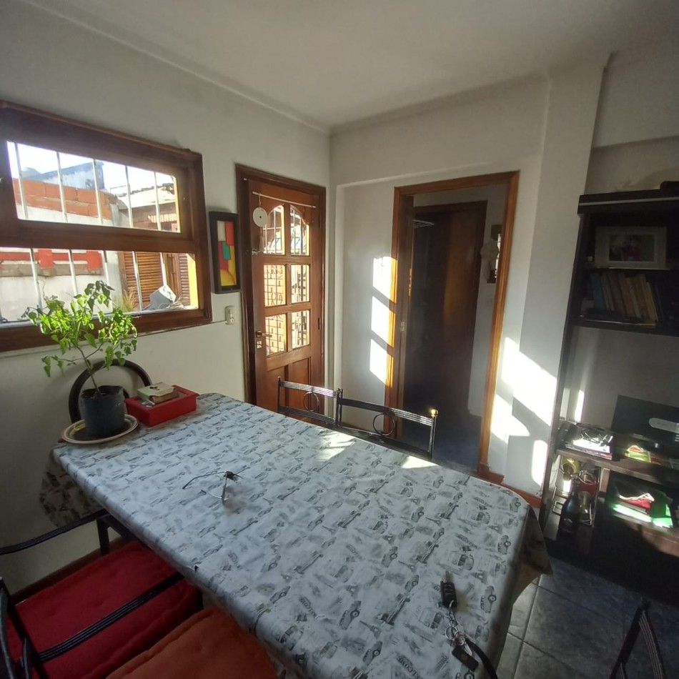 Living comedor con piso de cerámicos, ventanas hacia la calle y el patio trasero.